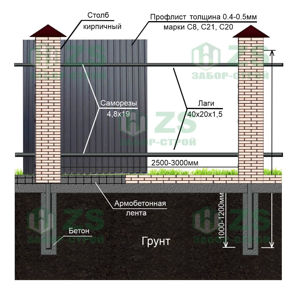 Конструкция забора из профнастила на ленточном фундаменте с кирпичными столбами:
